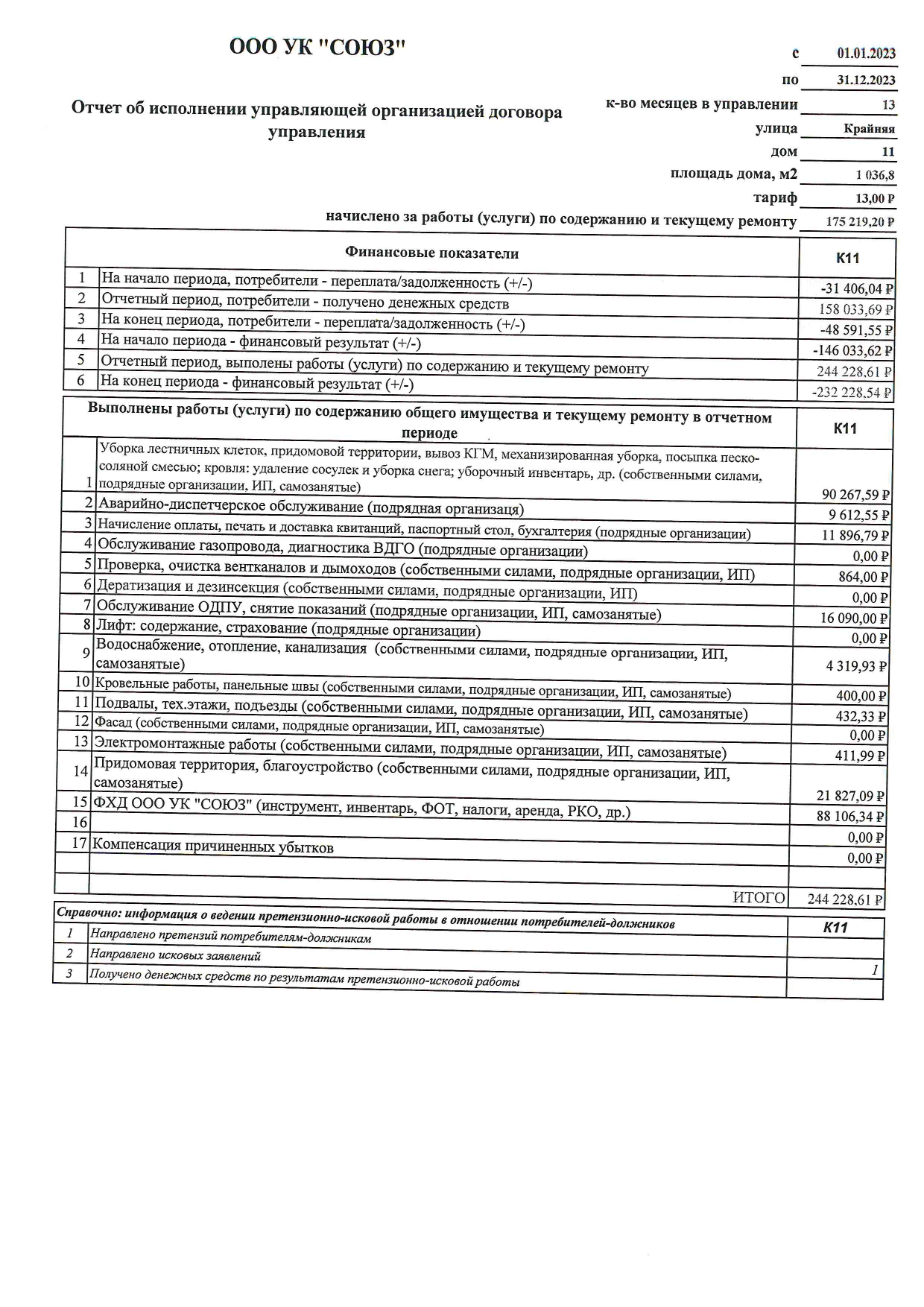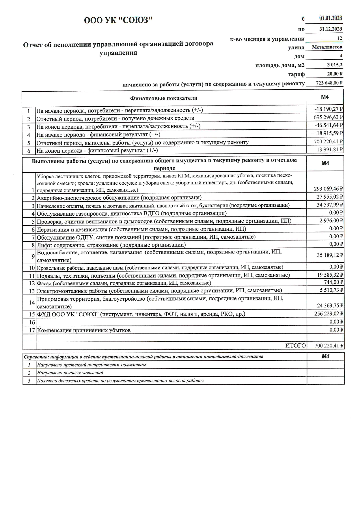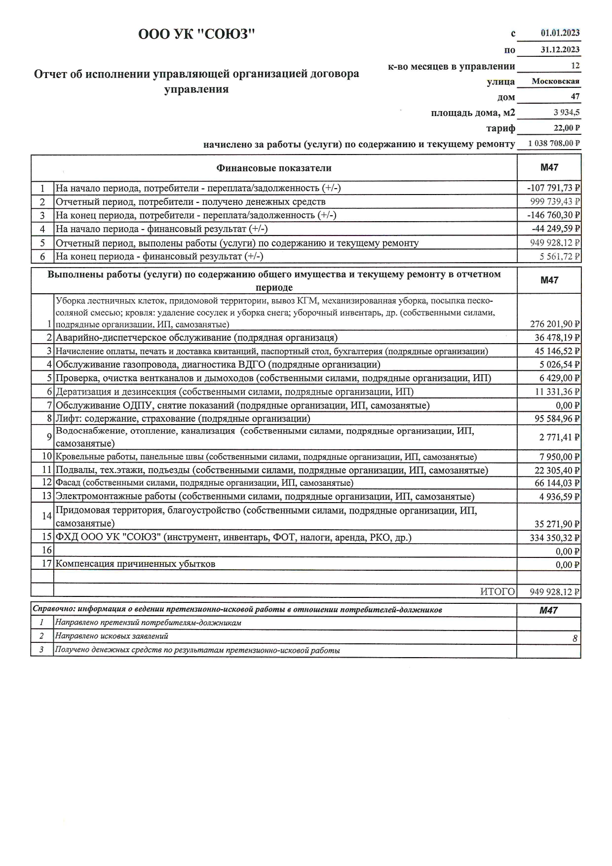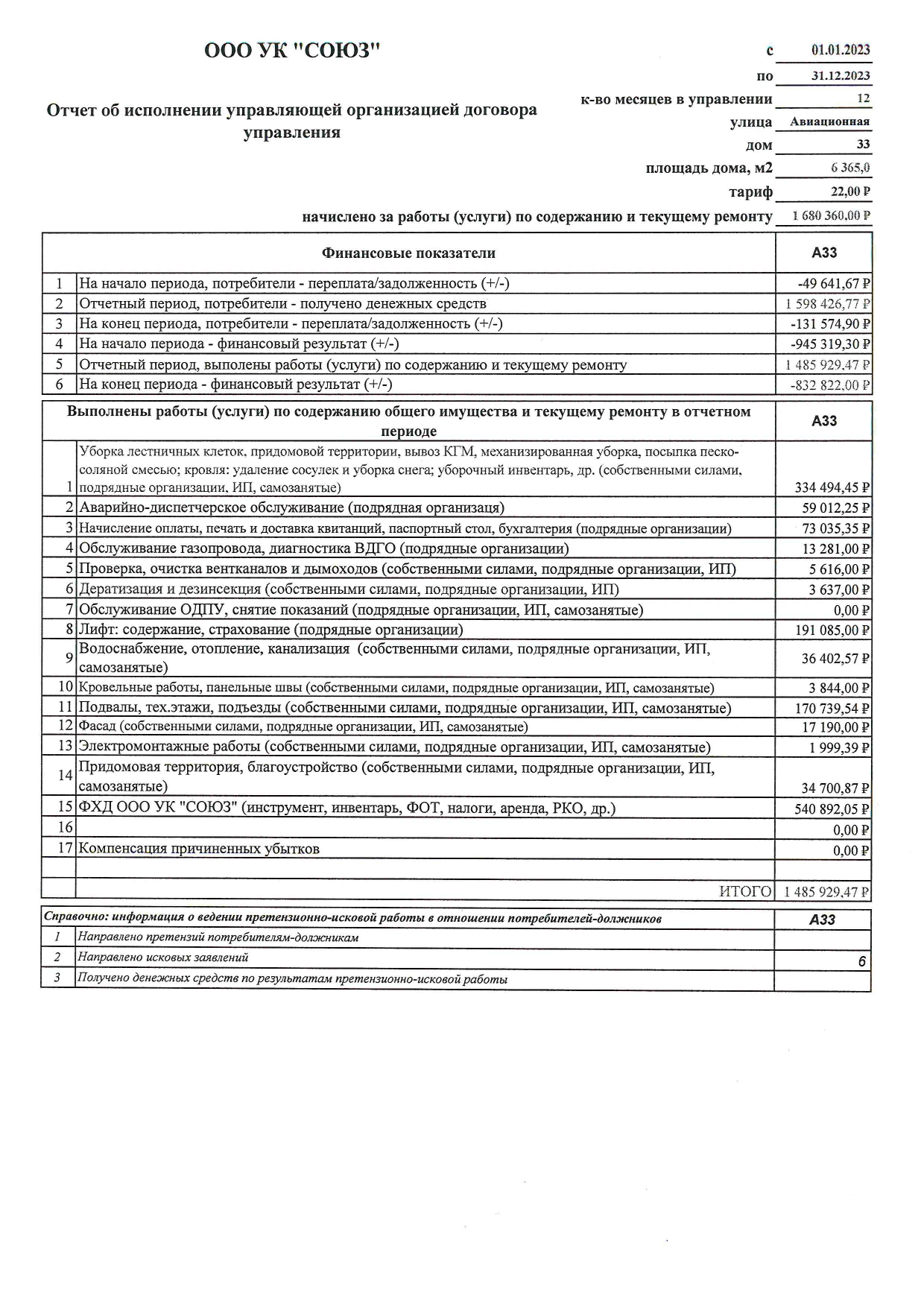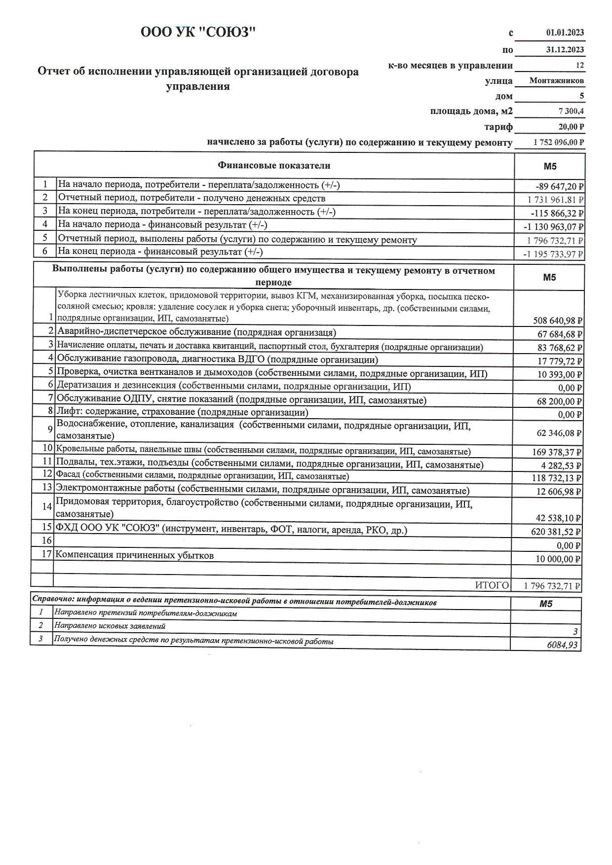 Отчет об исполнении управляющей организацией ООО "УК "СОЮЗ" договора управления: