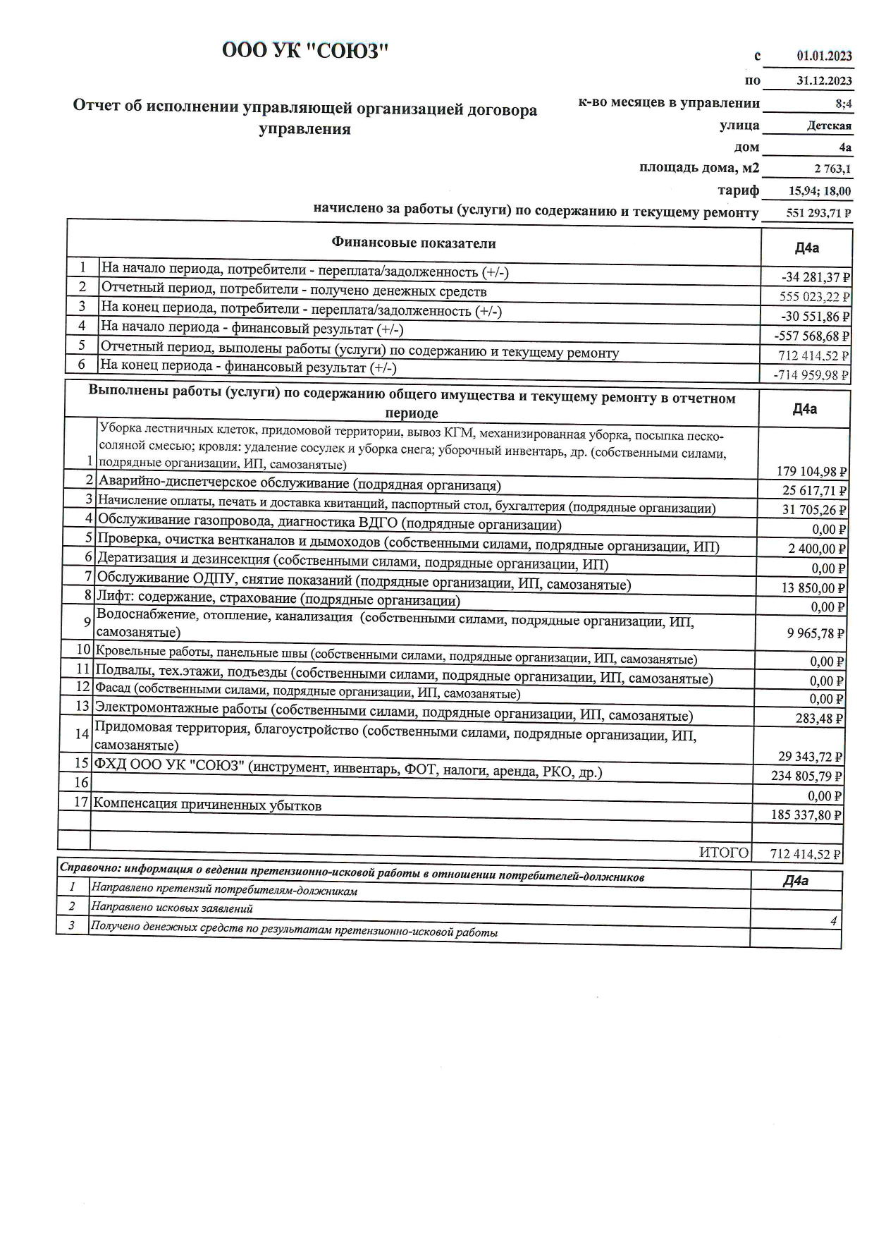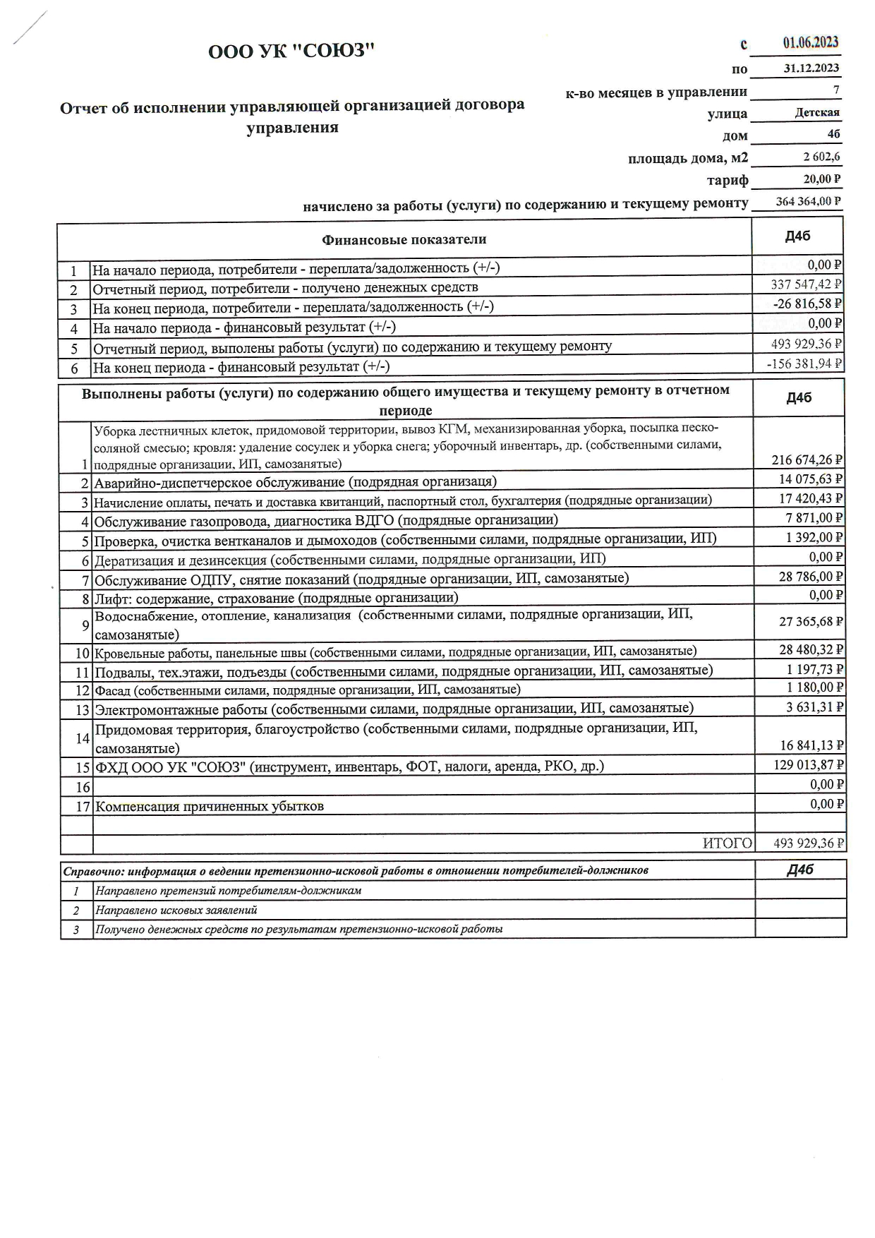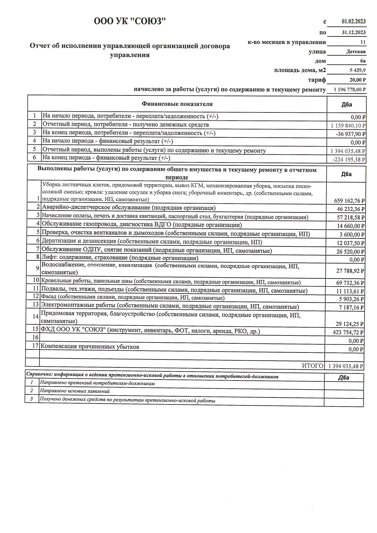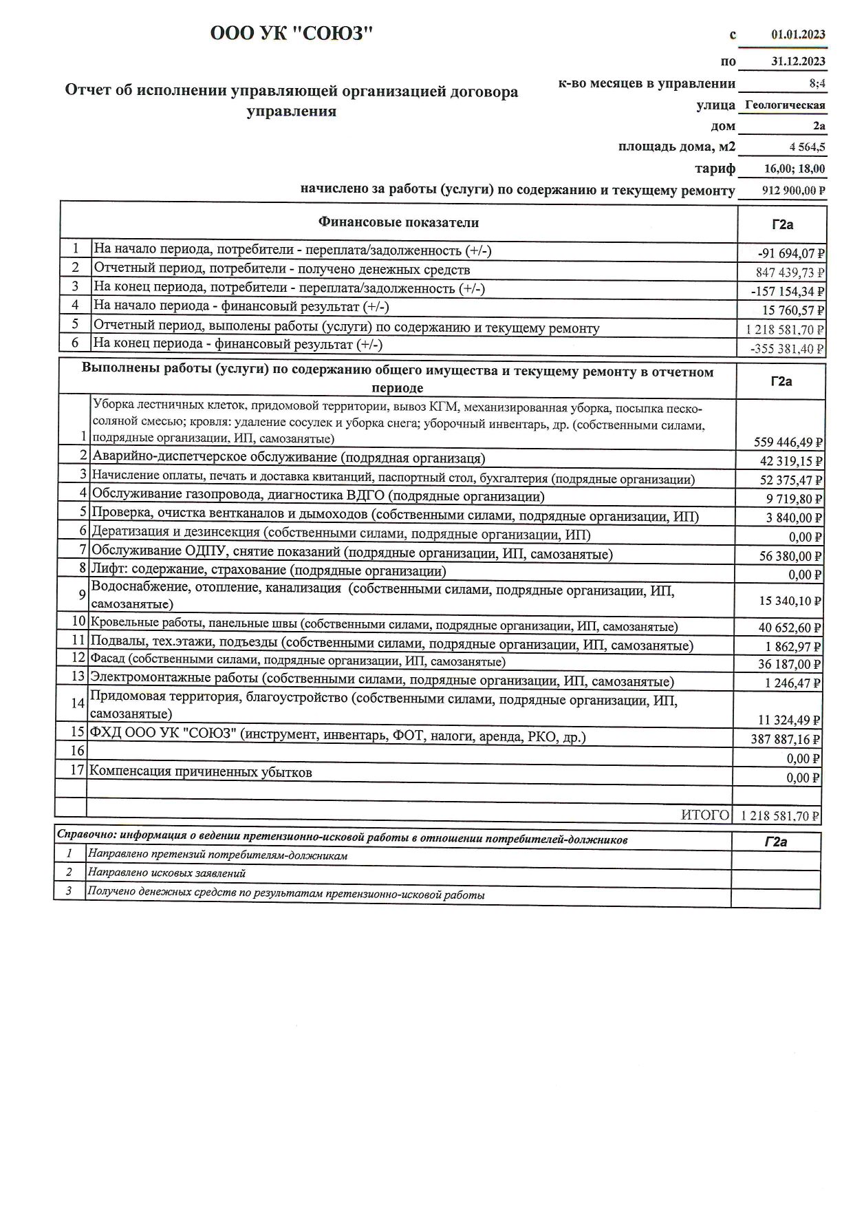 Отчет об исполнении управляющей организацией ООО "УК "СОЮЗ" договора управления: