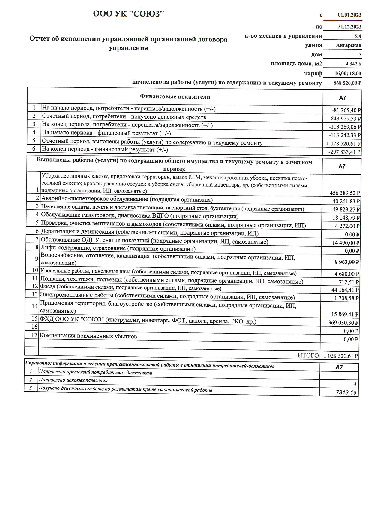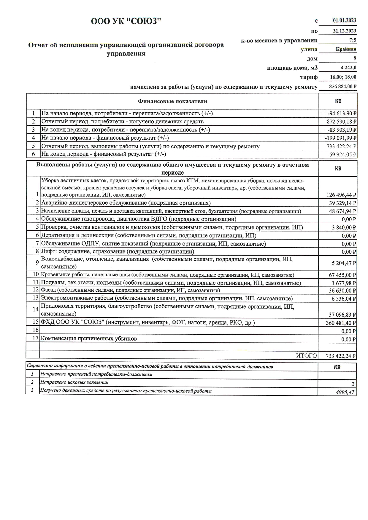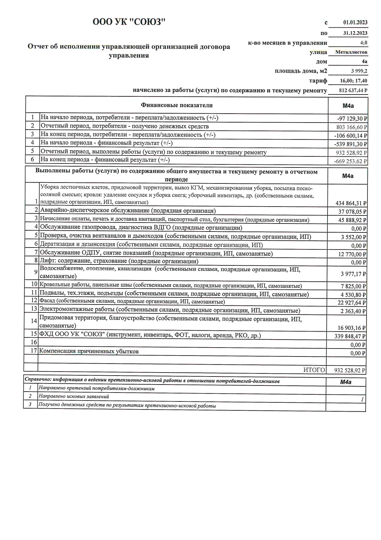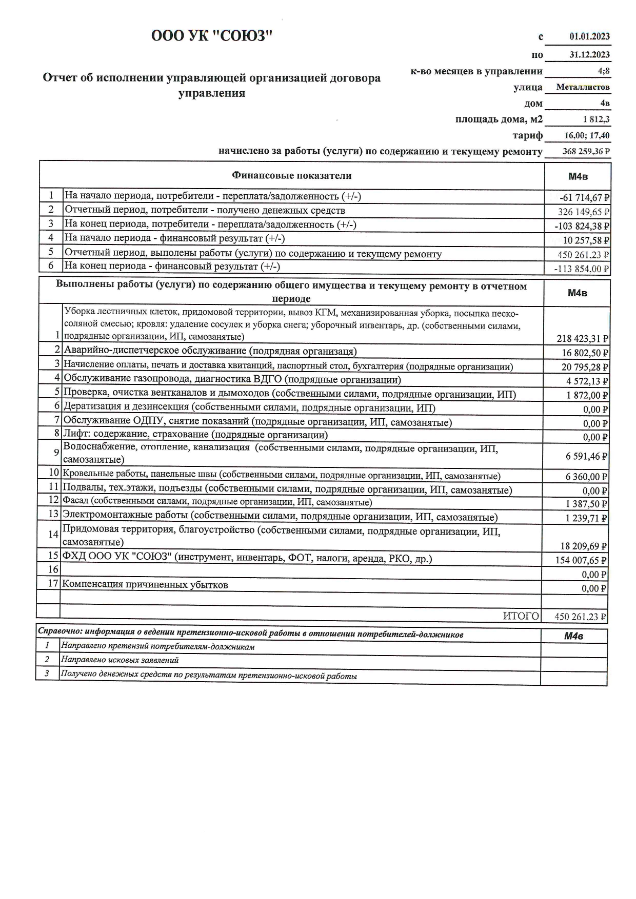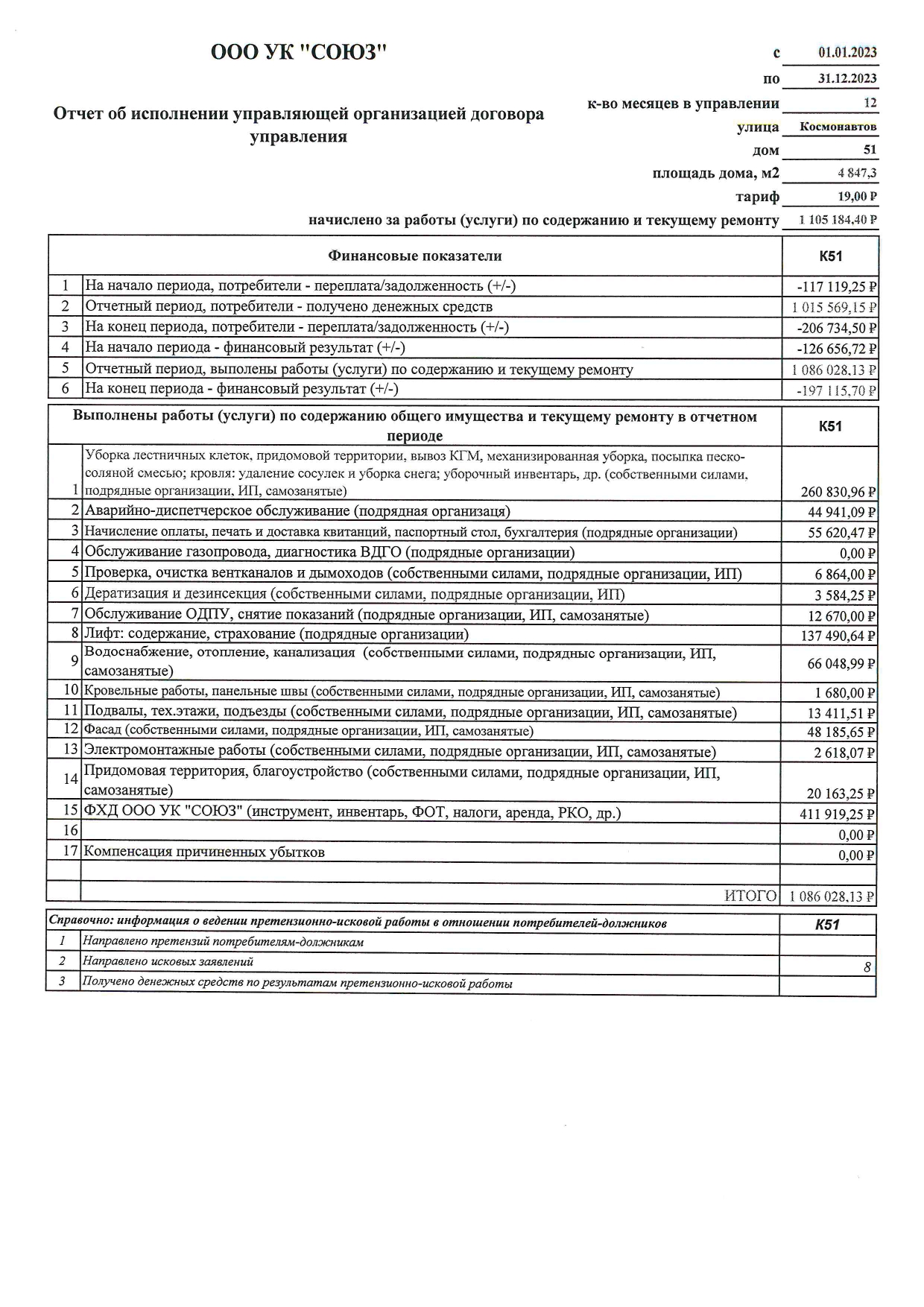 Отчет об исполнении управляющей организацией ООО "УК "СОЮЗ" договора управления: